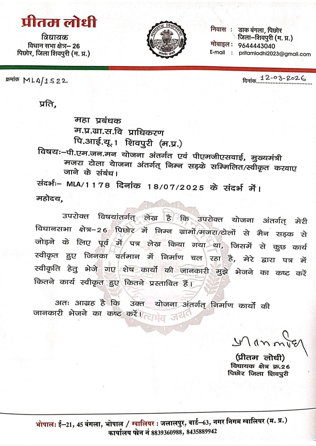 विधायक कार्यालय से जारी पत्र क्रमांक MLA/1522 (दिनांक 12-03-2026) के माध्यम से महाप्रबंधक, म.प्र.ग्रा.स.वि. प्राधिकरण, शिवपुरी को निर्देशित किया गया है कि: